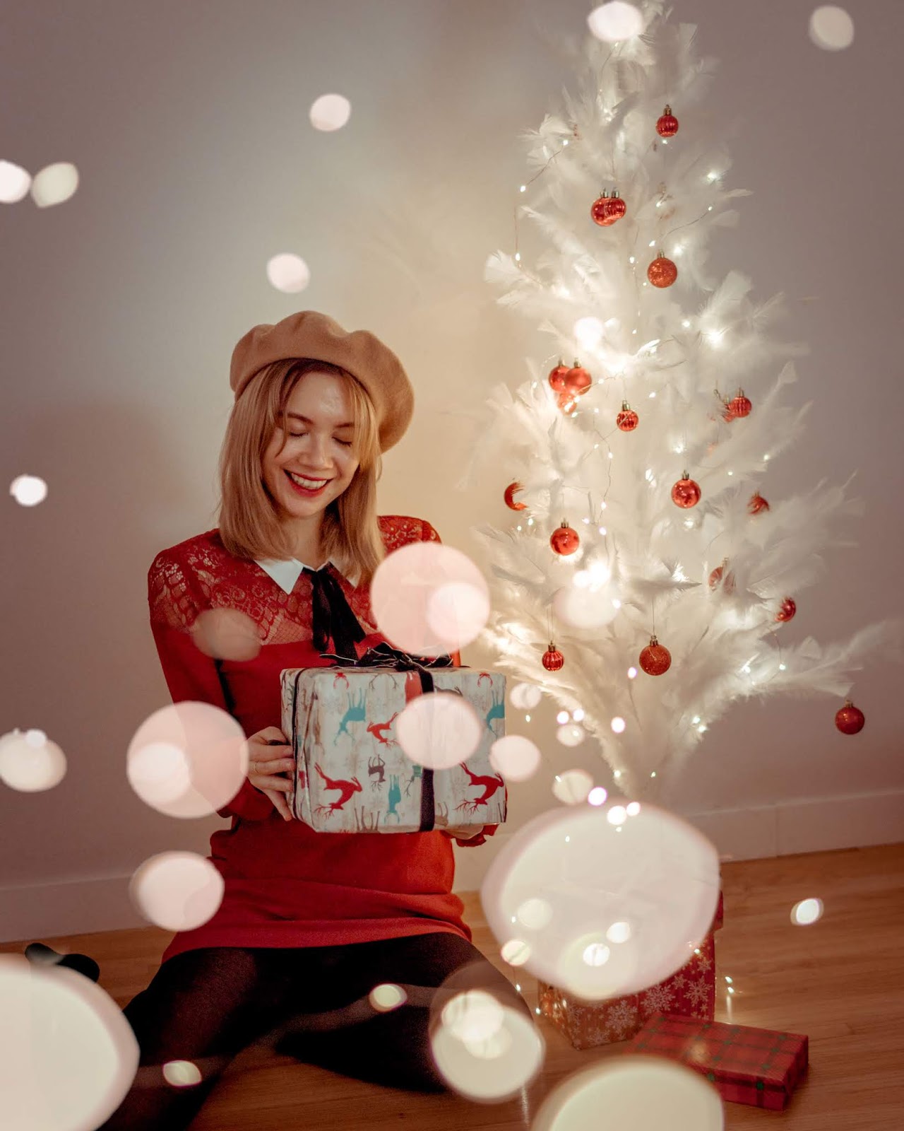 Keep it casual with a cute mini dress. Sweater dress, lace, anything goes. I chose a festive red for more holiday vibes, and a beret for a cute and functional accessory.
